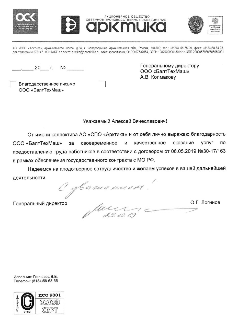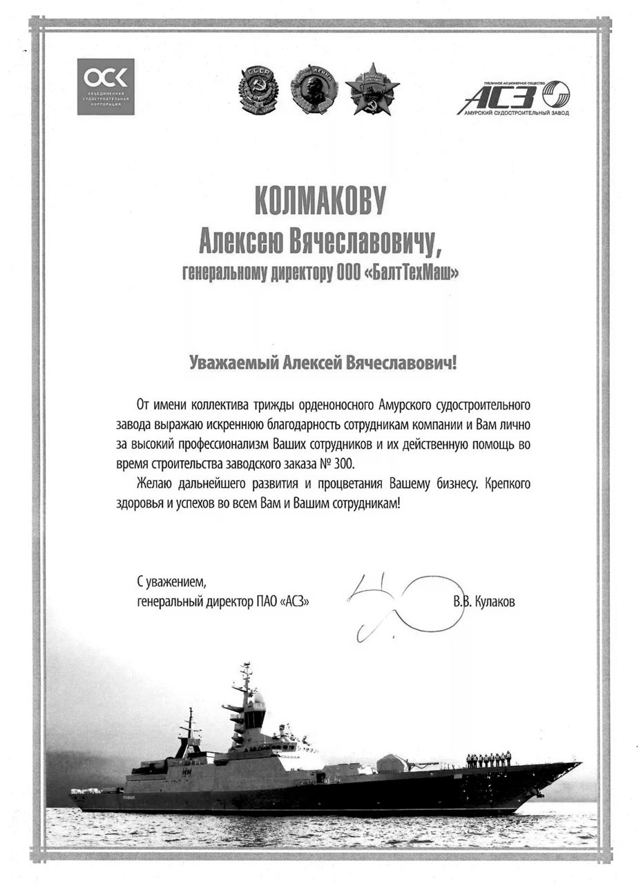 Благодарственное письмо от ПАО "АСЗ", г. Комсомольск-на-Амуре