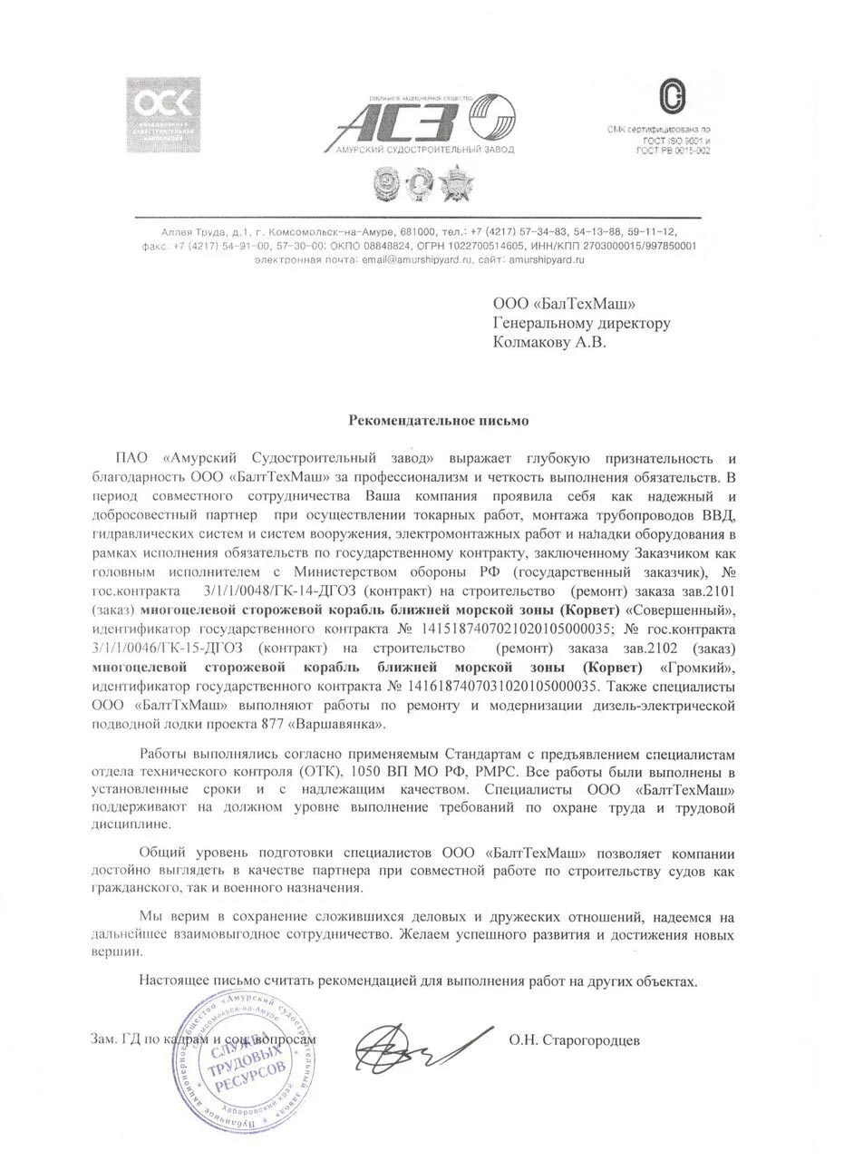 Рекомендательное письмо от ПАО "АСЗ", г. Комсомольск-на-Амуре