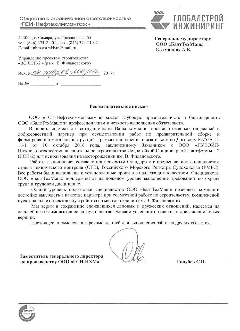 Рекомендательное письмо ООО "ГСИ-Нефтехиммонтаж", г. Астрахань