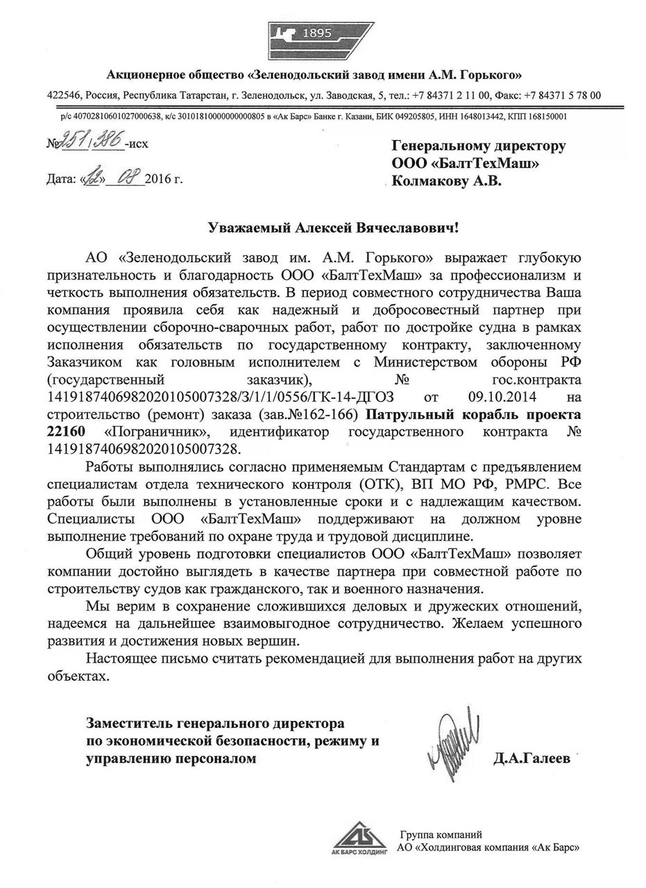 Рекомендательное письмо АО "Зеленодольский завод им. А.М.Горького"
